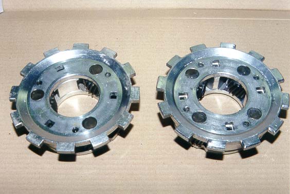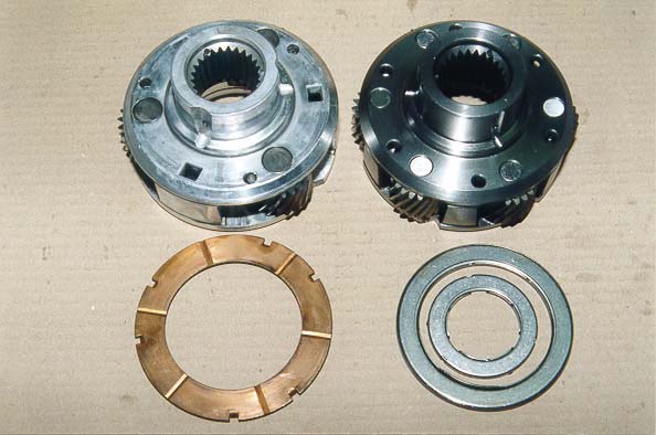 On the left the standard ratio 3 pin aluminium front planetary with standard thrust and on the right the optional 6 pin heavy duty steel planetary with needle roller bearings that will give you a much lower first and second gear ratio.